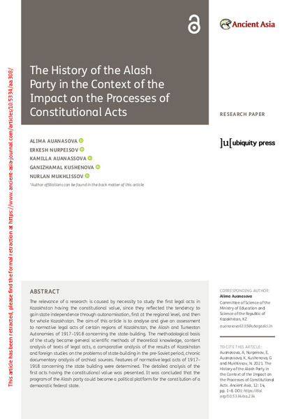 The relevance of a research is caused by necessity to study the first legal acts in Kazakhstan having the constitutional value, since they reflected the tendency to gain state independence through autonomisation, first at the regional level, and then for whole Kazakhstan. The aim of this article is to analyse and give an assessment to normative legal acts of certain regions of Kazakhstan, the Alash and Turkestan Autonomies of 1917–1918 concerning the state-building. The methodological basis of the study became general scientific methods of theoretical knowledge, content analysis of texts of legal acts, a comparative analysis of the results of Kazakhstan and foreign studies on the problems of state-building in the pre-Soviet period, chronic documentary analysis of archival sources. Features of normative legal acts of 1917– 1918 concerning the state building were determined. The detailed analysis of the first acts having the constitutional value was presented. It was concluded that the program of the Alash party could become a political platform for the constitution of a democratic federal state.