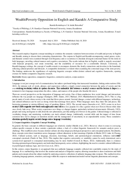 This research employs linguistic concept modeling to scrutinize the semantic variations between notions of wealth and poverty in English and Kazakh, aiming to discern their contrasting characteristics. The corpora in English and Kazakh encompassing varied genres, styles, and thematic content were examined through word frequency and co-occurrence to elucidate divergent contextual frames for the terms in both languages, unveiling cultural nuances and cognitive associations. The results indicate that in English, wealth is majorly associated with financial prosperity, real estate ownership, and the availability of resources for a comfortable lifestyle. Conversely, in Kazakh-language writings, the concept of wealth extends to encompass elements like family connections and devotion to the homeland, reflecting cultural priorities and lifestyles. A comparable distinction is evident when examining the contextual usage of the term poverty. The findings underscore the significance of exploring linguistic concepts within distinct cultural and cognitive frameworks, opening avenues for further comparative linguistic research.