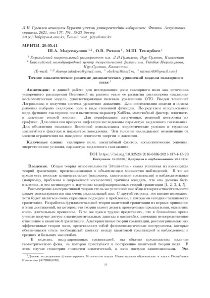 ускоренного расширения Вселенной на раннем этапе ее развития рассмотрена скалярная