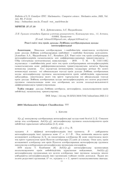 жұмысында ◦ -көпбейнесiнiң рангi екiге тең еркiн алгебраларының автоморфизмдерiнiң
